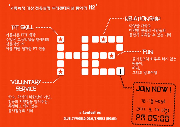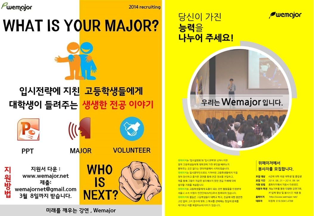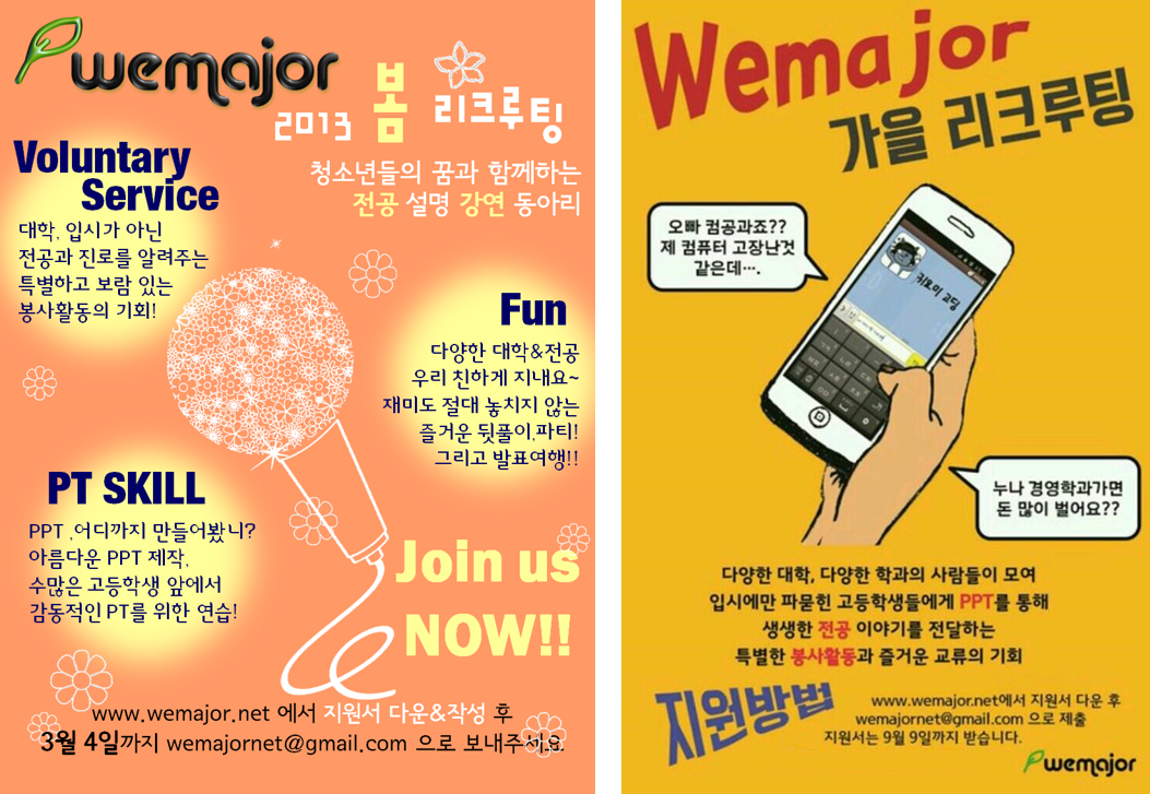 지금까지 2011년 H2의 홍보 포스터부터 2014년 위메이저의 겨울 리크루팅 홍보 포스터까지 살펴보았는데요. 이처럼 리크루팅 포스터만 보더라도 단체가 그 동안 어떻게 발전해 왔는지 엿볼 수가 있었습니다.