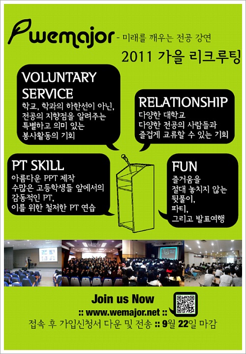 2011년 가을 포스터 인데요. 이 때는 국내 최초로(믿거나 말거나) 실제 홍보 전에, 티져용 포스터를 사용했습니다. 아무런 설명없이 마이크가 놓인 단상과 회원모집 네 글자, 그리고 홈페이지 주소만 덩그러니. 아주 아주 획기적인 시도였죠. (비록 실패했지만...) 그리고 몇 일 후, 실제 가을 리크루팅에 사용된 포스터가 세상에 나오게 됩니다. 2011 가을 포스터를 보시면 봄 리크루팅때와 크게 달라진 모습이 눈에 띄는데요. 보이시나요? 네, 2011년 가을 리크루팅은 위메이저라는 이름으로 진행된 첫 리크루팅이었답니다. 이 때는 리크루팅 기간동안, 이사진 세 명이서 포스터를 들고 서울 시내의 대학들을 돌아다니며 포스터를 붙였다고 하니 (한 학교에 100장씩 붙였다고 하는데….과연) 정말 힘들었을 것 같네요. 그래도 그런 노력들이 하나하나 모여 지금의 위메이저가 되었으니, 헛된 노력은 아니었다고 봅니다.